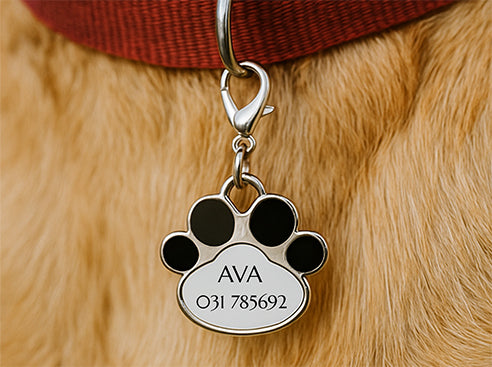 Poskrbite za varnost svojega ljubljenčka z našim personaliziranim ID obeskom! Vgravirajte ime in vaš kontakt, da zagotovite hitro vrnitev. Trpežna kovinska šapa z zanesljivo zaponko in stilskim dizajnom.