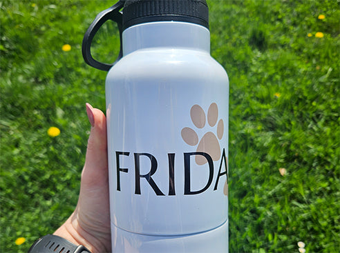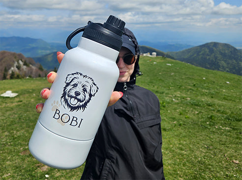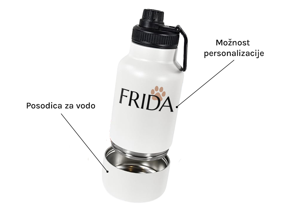 Spodnji del termovke se odvije in služi kot praktična posodica za vodo – brez potrebe po dodatni opremi. Rešitev, ki pride prav na vsakem koraku. Možnost personalizacije z imenom ali grafiko psa poskrbi, da izdelek izstopa tudi vizualno.